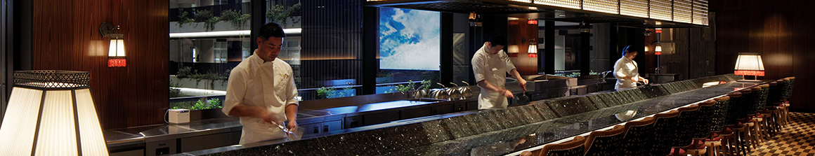 鉄板・デザート・BAR の3か所の趣の異なるカウンターで楽しめる。